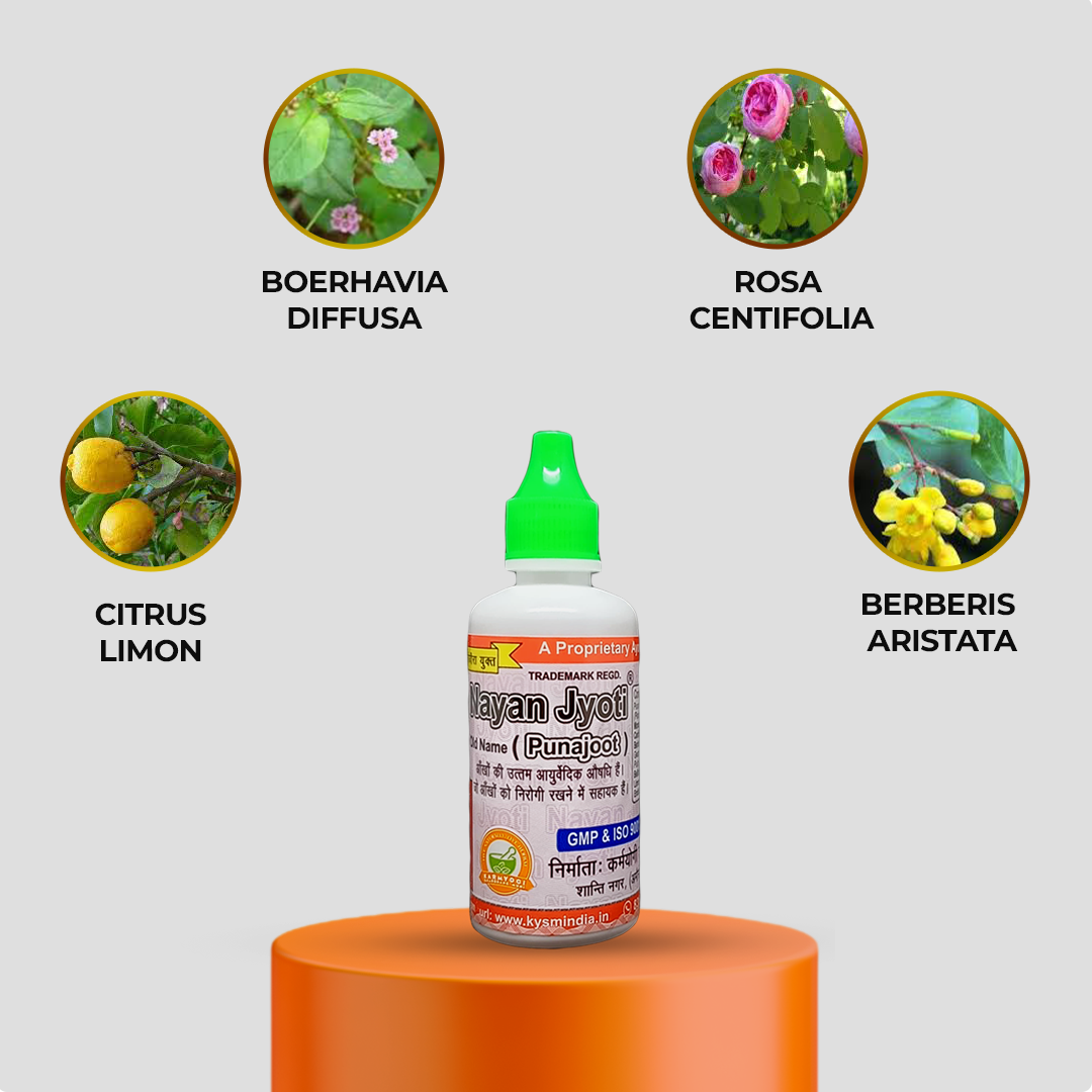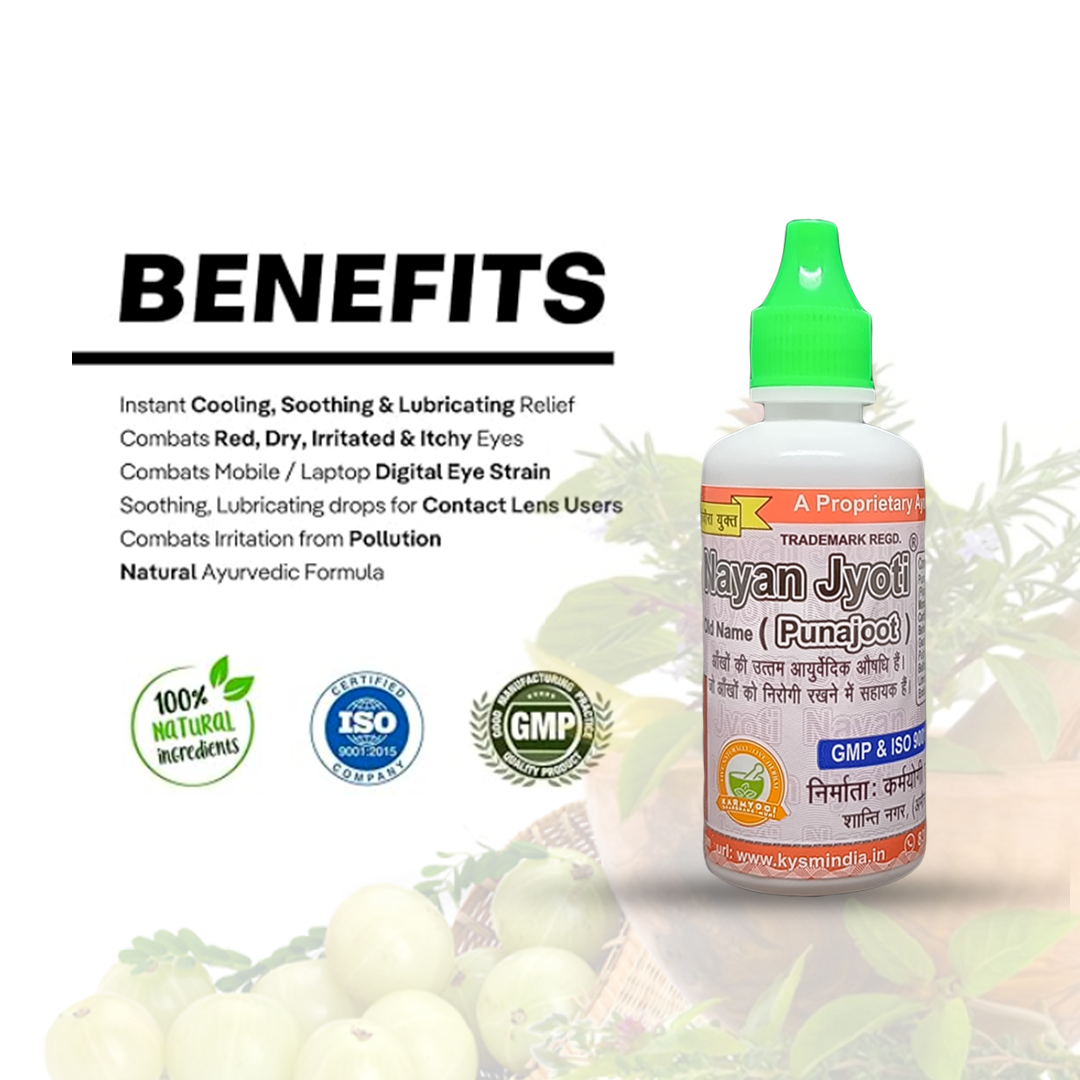 Eyes are among one the most beautiful gifts given by God to mankind. In the present world so much pollution and the increase in using electronic gadgets in our lifestyle may lead to many eye problems which if not treated properly and on time may give birth to serious eye problems. So it is very necessary to treat eyes with Ayurvedic medicine as they are herbal in nature and without any preservatives so it has no side effects. Nayan Jyoti( old name Puna Jyoti) is the best medicine known for curing various eye disorders. It is Good Medicine For Eyes prepared as told by Rawan (King of Lanka) with the combination of Punarnawa & other herbs for complete eye care.